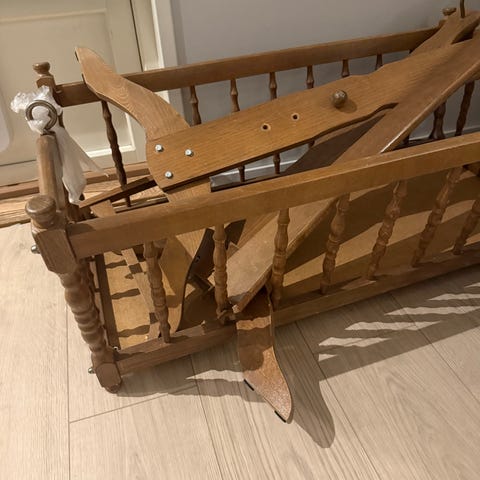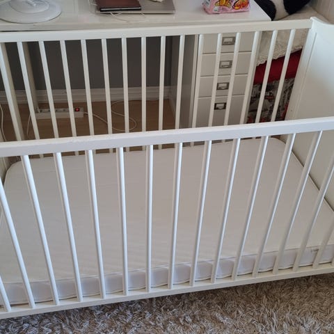 Nylig malt i hvit og rosa. Det er er skumgummi madrass i den(uten trekk), som kan følge med, samt madrassbesytter/overmadrass, og to laken.