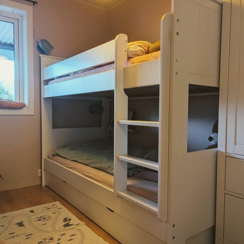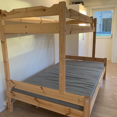 Veldig artig køyeseng da den har sofa og bord nederst og seng øverst:-) også mulig å lage om sofa og bord til seng når det er gjester på overnatting:-) Putene er blå og vi har malet bordplaten rosa:-) Putebetrekk kan taes av og vaskes. Madrass øverst kan følge med om ønskelig:-) Vanlig bruksslitasje:-) De 3 pynteputer og kaninbamsen følger ikke med. Er demontert ved henting:-) Lignende seng kan ses her: https://www.hoppekids.com/no-no/products/eco-dream-jumbo?gad_campaignid=22700723658&gad_source=1&gbraid=0AAAAAqJM5FN5jRbkgW9KtAhuWma2KL1uK&gclid=CjwKCAiA3fnJBhAgEiwAyqmY5XJqjunLjbNrQFw8fGjchZbr0LLd8WY4c_L1C0LA7G9U2T0QN6KoyRoCLOYQAvD_BwE&variant=46020249256258