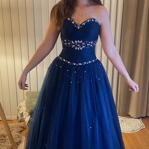 Leier ut en helt nydelig mørkeblå ballkjole! Den er ikke sydd opp så den er lang! Den er i strl M men den er veldig liten i strl! Den har knyting så passer alt fra en liten S til en liten L. Den er ikke sydd opp og vil si den passer alt fra 170-180 hvis man har hæler!