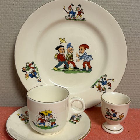 Barneservice består av en flatt tallerken, dyp tallerken, krus og kopp med underfat. Alt av porselen, produsert i gamle GDR. Motivet er fra sovjetisk tegnefilm Nu, pogodi! (Bare vent!).