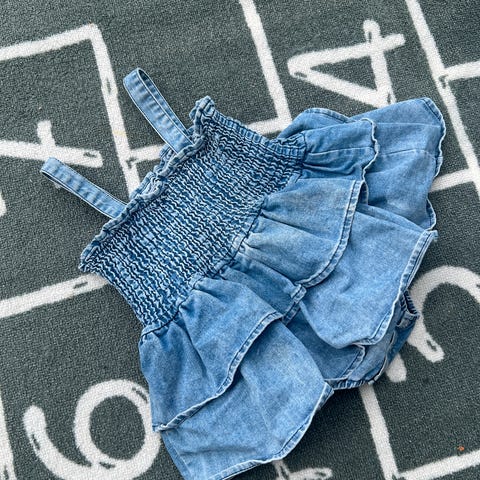 Pent brukt denim selekjole til baby. Klassisk blå farge med søt hjerte-detalj foran og volangkant øverst. Trykknapper på stroppene gjør den enkel å ta av og på.