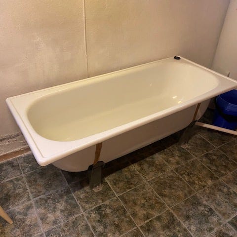 Hvitt badekar laget av plastmateriale. Passer til baderom og kan brukes til bading.