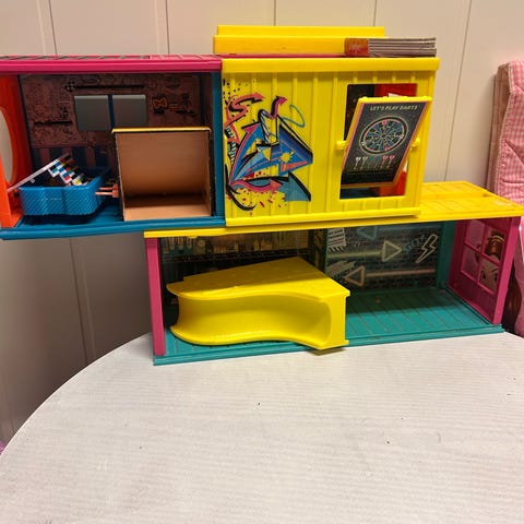 L.O.L. Surprise lekesett som inkluderer en blå og rød lekecontainer med graffiti, en gul sklie, en rampe og en stige. Egnet for barn, laget i plastmateriale. Settet gir mulighet for kreativ lek og utforskning.