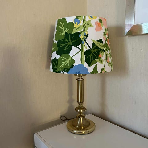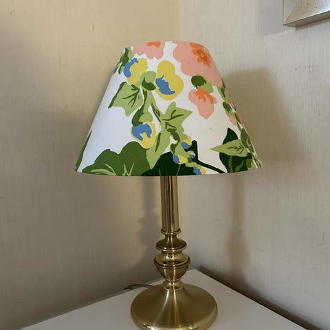 Stor messinglampe med håndlaget skerm i stoff fra franske Souleiado Høyde opp til sokkkel 39 cm, med skjerm 62 cm