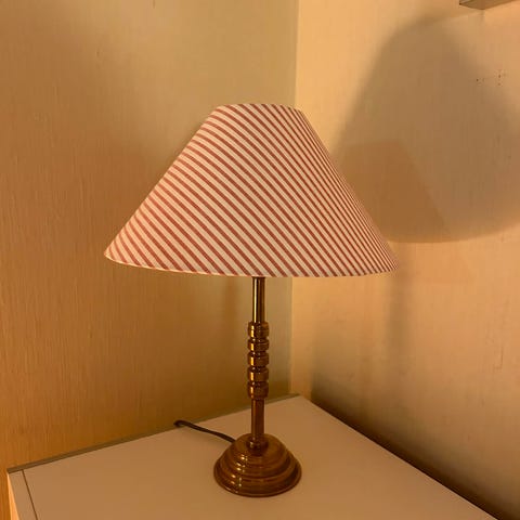 Messinglampe med håndlaget håndlaget skjerm i stoff fra Studio Bazar Høyde 28 cm opp til sokkel, 50 cm med skjerm