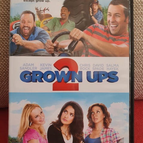 DVD-utgave av filmen Grown Ups 2 med Adam Sandler, Kevin James, Chris Rock og David Spade. Filmen er på engelsk og har undertekster på flere språk. Inneholder bonusmateriale og ekstramateriale. Passer for voksne seere.