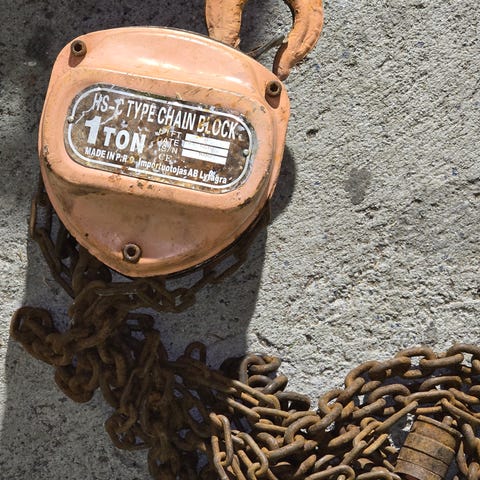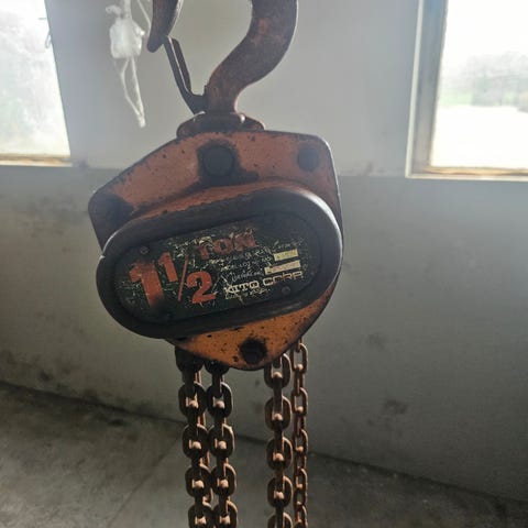 Tiger kjettingtalje med kapasitet på 3 tonn. Utstyrt med kjetting og krok for løfting og flytting av tunge gjenstander.