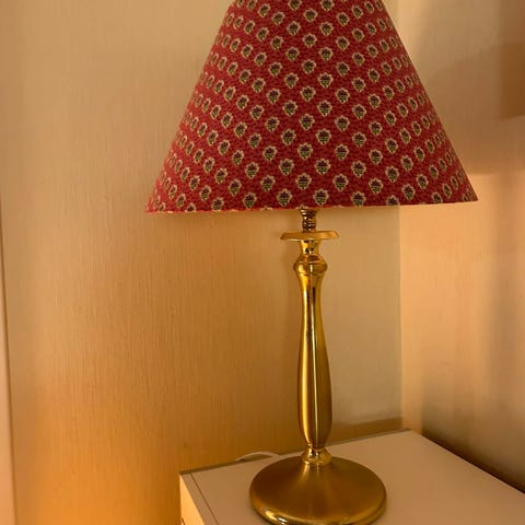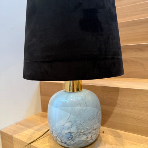 Søt liten onyxlampe med håndlaget skjerm i stoff fra Studio Bazar Høyde opp til sokkel 17 cm, med skjerm 32 cm