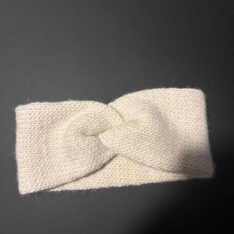 Nystrikket pannebånd og votter med falskefletter og hjertemotiv.