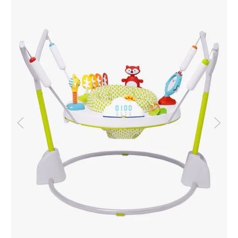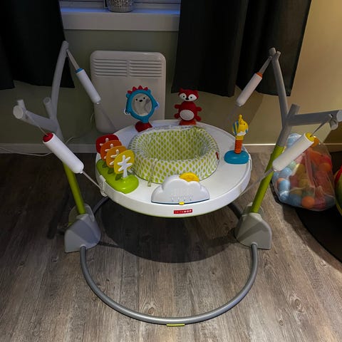 Kan brukes fra 4 mnd til 11 kg - vært veldig populær hos begge mine barn. Nypris var ca 2000 så selges for 500. Fremstår pent brukt, lyd og lys virker som det skal på «pianoet». Dette er ikke en hoppestol men en aktivitetsstol som barnet «sitter» i - typ mageleiestilling