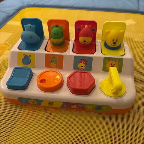 Fint og fargerikt aktivitetssenter. Trykk, vri og skyv på knappene og figurene spretter opp! Med denne aktivitetsleken kan barnet bli kjent med dyr, farger og tall, og stimulere syns- og følesansen.