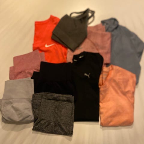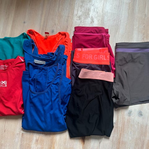 Settet inkluderer ulike plagg i forskjellige farger og materialer, egnet for generell trening og aktivitet.