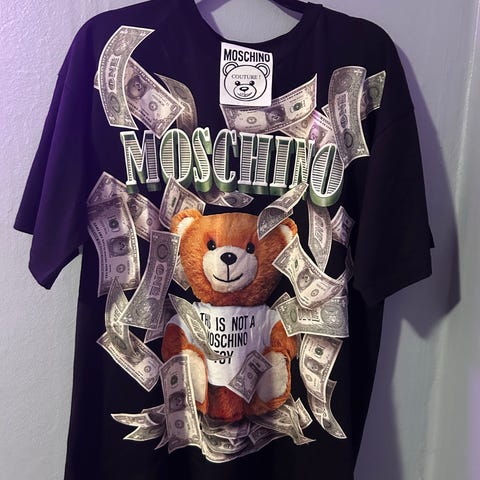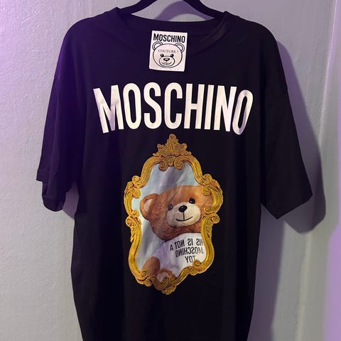 Legger ut en ny og ubrukt Moschino × H&M t-shirt i mesh/jersey-stoff, fra det ettertraktede Moschino samarbeidet med H&M i 2018.