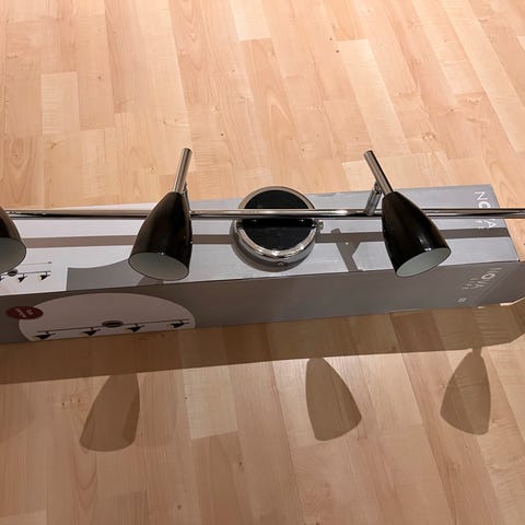 Taklampe med justerbare spotter. Vært montert og brukt i 3 måneder før den ble demontert. Monteringsskinne medfølger.