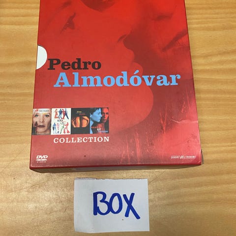 Pedro Almodóvar Collection DVD boks med filmer som inkluderer Bad Education, Talk to Her, Tie Me Up! Tie Me Down!, og All About My Mother. Boksen inneholder flere filmer regissert av Pedro Almodóvar, med originalt omslag og aldersgrense 18 år.
