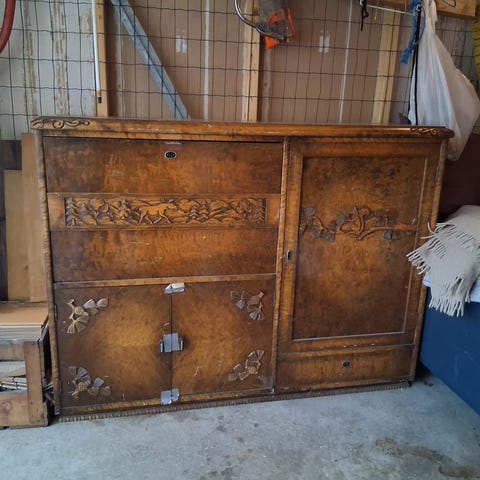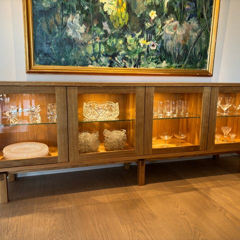 Flott og velholdt skjenk og vitrineskap i håndskåret eik - kjøpt hos Mortensen Møbler.