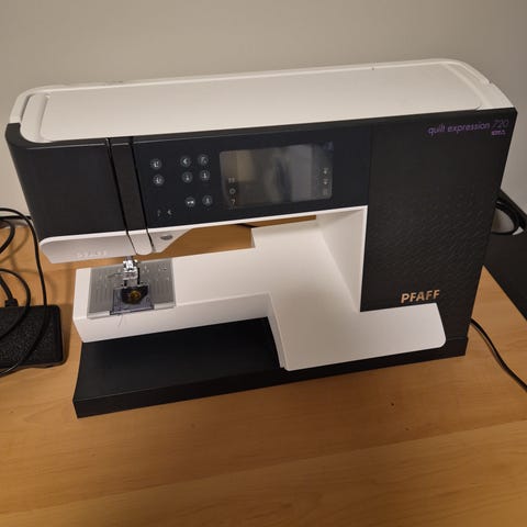 Pfaff symaskin med flere sømvalg og digitalt display. Maskinen er designet for presisjonsarbeid og har funksjoner for ulike syprosjekter.