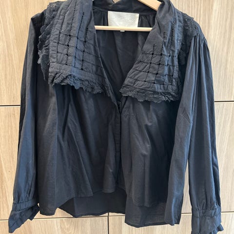 Blusen er i myk kvalitet og sitter fint , lange ermer og knapper deler av forstykket. Fine detaljer på blusen. Kan sendes om kjøper betaler frakten .
