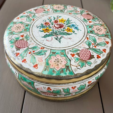 Selger pynte rund boks med blomster i fin stand.