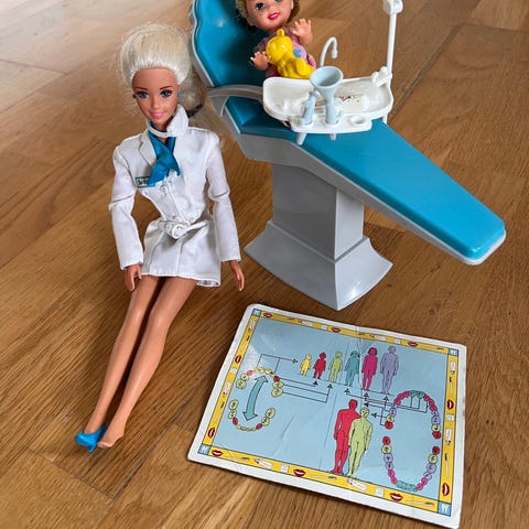 Barbie - Fred, kjæresten til Petra. dukke med rosa satengjakke, hvite bukser og solbriller, og flære klær - se bilder. Dukken har blå øyne og kort grått hår. Jakken har knapper foran og solbrillene er tilbehør. Dukken er omtrent 30 cm høy.