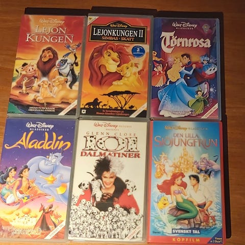 Selger 4 originale Walt Disney VHS-filmer. Klassiske titler fra Disney-katalogen. Pent brukte, med originalkassetter. Ikke testet nylig, men oppbevart tørt og normalt.