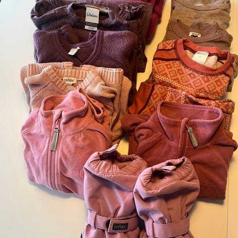 barneklær for jente i størrelse 86 med flere plagg i ulike farger og materialer. Inkluderer blant annet heldrakt, kjole og genser i flerfarget design.