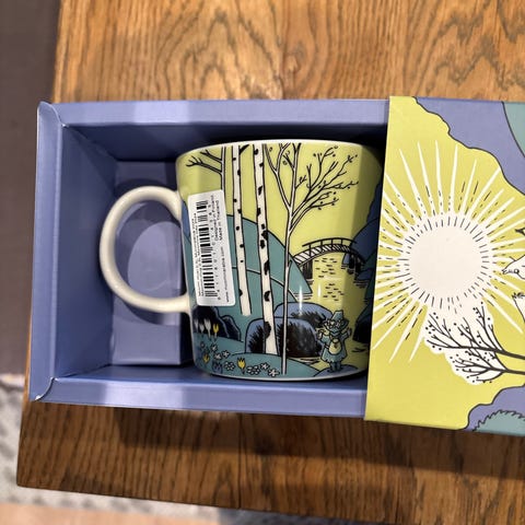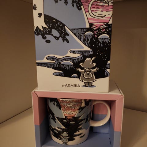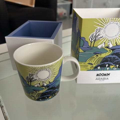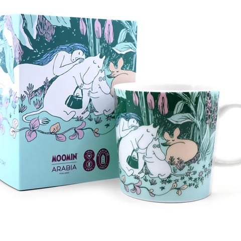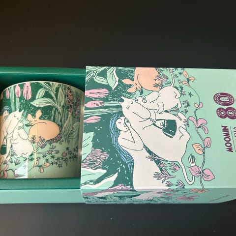 Arabia Moomin krus, servietter og krukke med venner for alltid mønster. 80 års jubilæum. Helt nyt. Kan hentes i Oslo