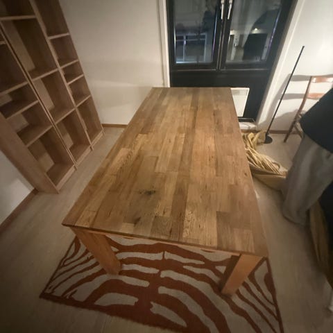 Supert spisebord, tar imot bud!❤️ Heltre eik føtter, eik finer overflate. Overflaten er en del slitt, men absolutt ikke verre enn at det er fullt brukbart. Tilstanden ellers er veldig bra. 1,75 x 95, med to ekstra klaffer som gir mye mer lengde.