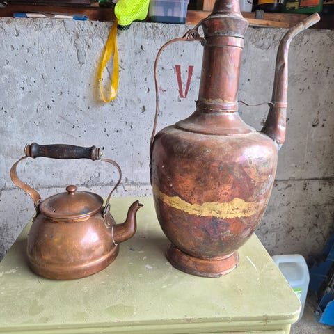 Stor kobberbelagt kjele. Høgde 31 cm til toppen av lokket, diameter 26 cm i botnen, 36 cm frå enden av tuten til enden av hanken. Flott når den er nypussa.