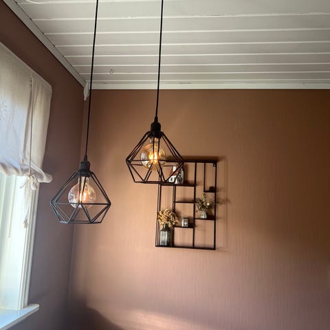 Lampeskjermer høyde 14 cm, 15cm diameter nederst og 11 cm diameter topp. 2stk igjen. Selges samlet. Gjennombrutte. Gyldene inni, sorte utenpå.