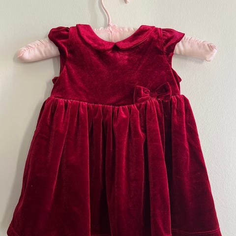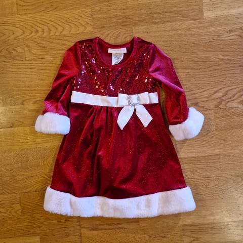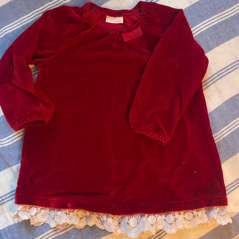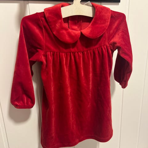 Lindex Jente kjole i størrelse 80, laget av rød velur/cordfløyel. Kjolen har lange ermer og dekorative detaljer i kantene.