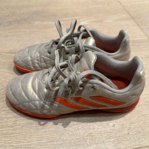 Adidas Copa fotballsko i størrelse 36. Skoene er mørkeblå med oransje detaljer. Gummisåle tilpasset kunstgress eller harde underlag.