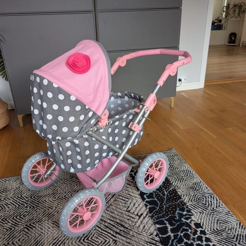 Selger en dukkevogn / trillevogn. Den rosa vognen på bildet er solgt. Vognen er godt brukt, men det er mye kjekk lek igjen i de.
