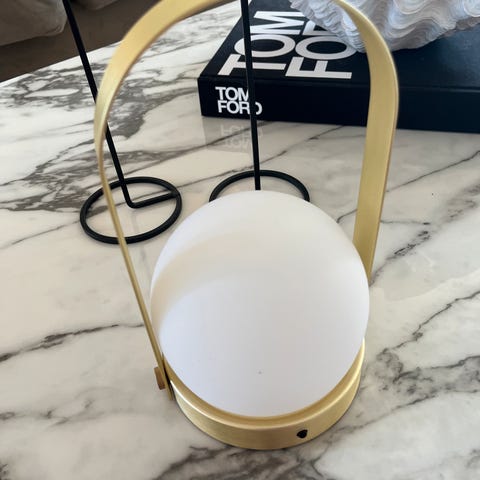 Pent brukt lampe. Kan brukes ute og inne. Lades opp. Kan også henges på vegg.