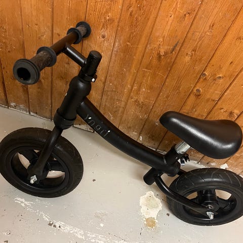 Trehjulssykkel for barn med skyvestang. Farge svart. Sykkelen har sete med ryggstøtte og håndtak for skyving. Egnet for små barn som trenger støtte under sykling.