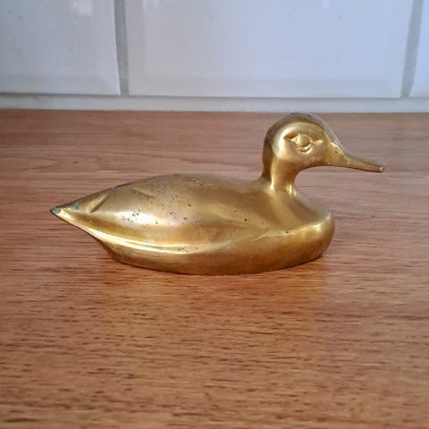Flott veggpynt i massiv messing, vintage fra Taiwan. Ender som motiv. Høyde ca 17 cm, lengde ca 21 cm. I god stand, noen små bruksmerker.