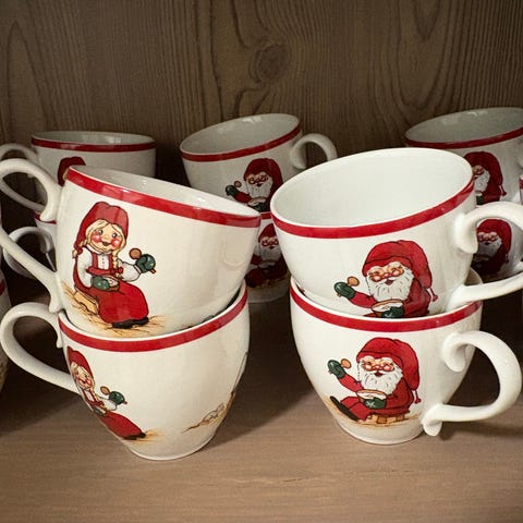 12 stk meget pent brukte kopper med tefat fra serviset Gledelig Jul. De er lite brukt.