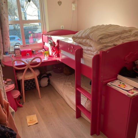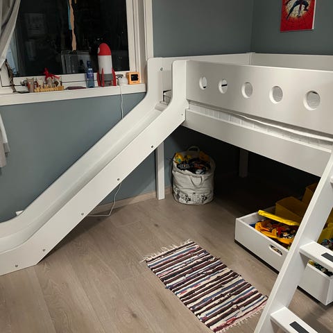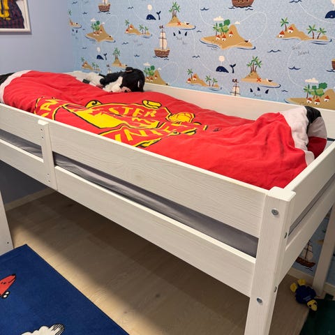 NY PRIS Godt brukt halvhøy seng. Veldig populært med lekeplass under sengen! Maks høyde: 116 cm, høyde under seng 80 cm, bredde 102, lengde 209. Det følger med spilebunn (vi har skrudd fast alle spilene for å være sikker..)