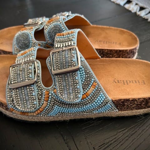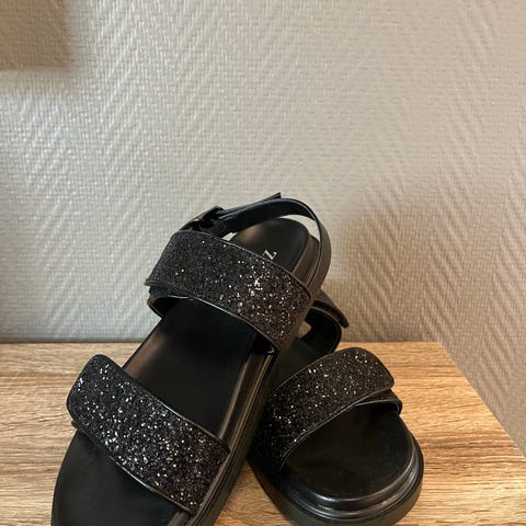 Glitter sandaler i størrelse 38. Sandalene har kryssede stropper dekorert med små perler eller glitterdetaljer. Fargen er lys og nøytral, og materialet ser ut til å være syntetisk med polstret såle for komfort.