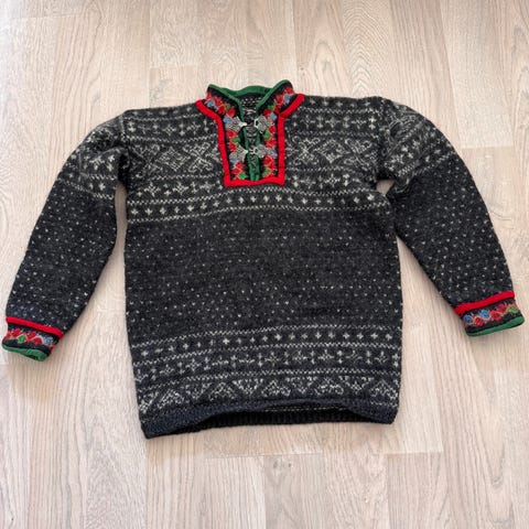 Til salgs: ullgenser fra AS Bergens i svart og rødt tradisjonelt mønster, størrelse L. Genseren har tinnhekter i front og er strikket i solid ull som gir god varme på kjølige dager.