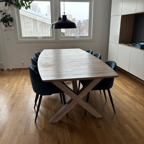 Bord Novasol eik mål 1x240 eller 1x300 med ileggsplate i bordet. 10 stoler hører med. Totalpris for alt : kr 15000. 5-6 år gammelt
