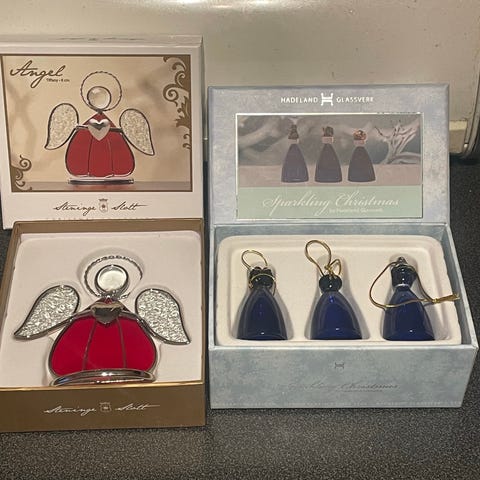 3 stk Hadeland Tiffany glassengler. 2 stk Lene Bjerre hester på kjelke. 1 stk Lene Bjerre skøyter. Alt samlet kr 600,-