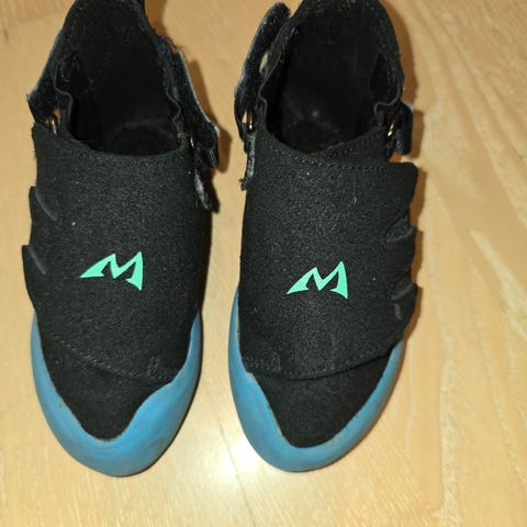 Mad Rock klatresko i størrelse 39,5 med svart og grå farge. Skoene har borrelås for justering og gummisåle for godt grep. Passer for klatring og buldring.