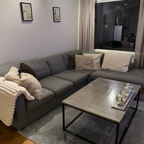 Selger en pen og komfortabel grå hjørnesofa med sjeselong. Sofaen har justerbare nakkestøtter. Modern og stilrent design som passer godt i de fleste stuer.