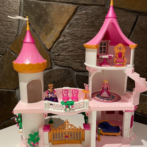 Playmobil eventyrslott med flere tårn, spiraltrapp og en stor port. Inkluderer to figurer, en konge og en dronning, samt møbler som stol og bord. Settet er komplett med alle deler og figurer.