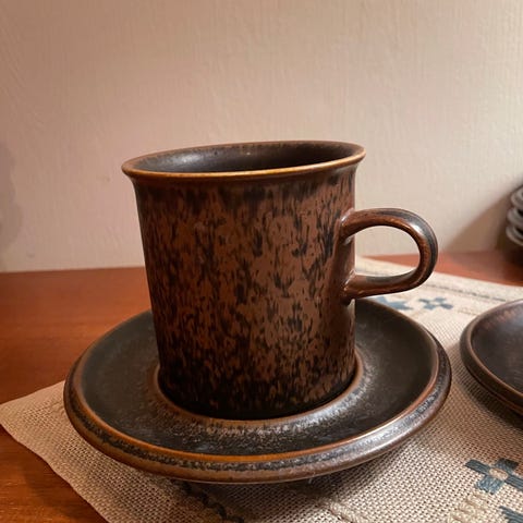 Arabia Kopp, m underslår og tallerken med blått mønster