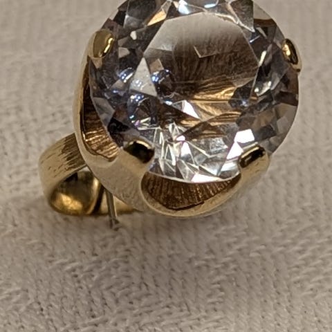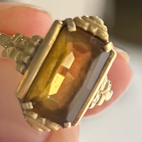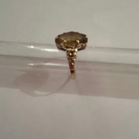 Selger en råflott eldre ring av 14 karat gultgull med en nydelig, grønn turmalin liknende sten. Jeg vet ikke om sten er ekte eller syntetisk. Den er ca 1,2 cm lang. Glansfull, (ser med gullsmedlupe , 20 x forstørrelse, at den har noen ørsmå / nær mikroskopiske nag. Som bilder viser er det ikke synlig med det blotte øye. )
