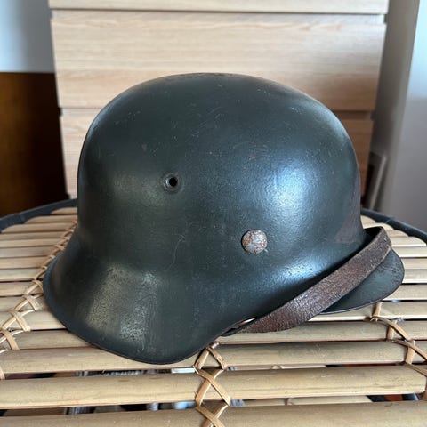 Selger en original tysk stålhjelm (Stahlhelm) fra andre verdenskrig.
