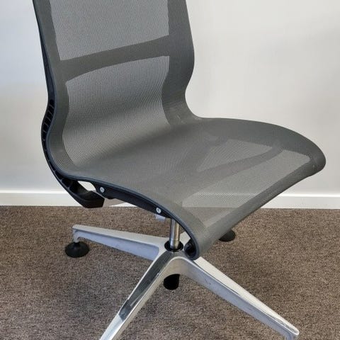 Herman Miller Stacking Chair med sete og rygg i oransje plast og ben i stål. Stolen er designet for enkel stabling og oppbevaring. Egnet for bruk i kontor- eller møtelokaler.