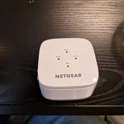 WiFi Signalboost nettverksforsterker for forbedring av trådløst nettverkssignal. Enhetene er hvite og har tilkoblingsporter for strømadapter og nettverkskabel. Egnet for bruk i hjem eller kontor for å øke rekkevidden til eksisterende WiFi-nettverk.